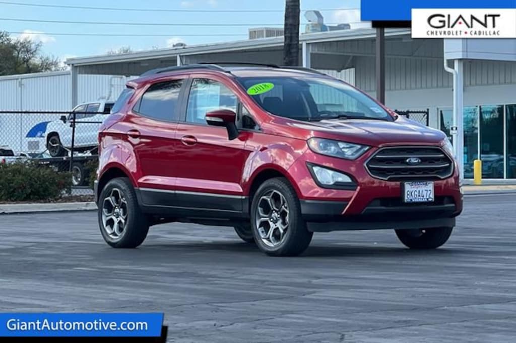 Giant Chevrolet is proud to offer this 2018 Ford EcoSport SES Ruby Red. Clean CARFAX. 2.0L I4 Ti-VCT GDI 60 pt Inspection, Low Miles, Extra Clean!, One Owner, Non Smoker!, 4x4 / AWD/ Four Wheel Drive, Recent Oil Change, Well equipped with 4-Wheel Disc Brakes, Well equipped with 7 Speakers, Well equipped with ABS brakes, Well equipped with Air Conditioning, Well equipped with Alloy wheels, Well equipped with AM/FM radio: SiriusXM, Well equipped with AppLink/Apple CarPlay and Android Auto, Well equipped with Auto-dimming Rear-View mirror, Well equipped with Automatic temperature control, Well equipped with Axle Ratio: 3.51, Well equipped with Brake assist, Well equipped with Bumpers: body-color, Well equipped with Compass, Well equipped with Delay-off headlights, Well equipped with Driver door bin, Well equipped with Driver vanity mirror, Well equipped with Dual front impact airbags, Well equipped with Dual front side impact airbags, Well equipped with Electronic Stability Control, Well equipped with Emergency communication system: SYNC 3 911 Assist, Well equipped with Equipment Group 300A, Well equipped with Exterior Parking Camera Rear, Well equipped with Front anti-roll bar, Well equipped with Front Bucket Seats, Well equipped with Front Center Armrest, Well equipped with Front fog lights, Well equipped with Front reading lights, Well equipped with Front wheel independent suspension, Well equipped with Fully automatic headlights, Well equipped with Heated front seats, Well equipped with Illuminated entry, Well equipped with Knee airbag, Well equipped with Leather Shift Knob, Well equipped with Low tire pressure warning, Well equipped with Navigation System, Well equipped with Occupant sensing airbag, Well equipped with Outside temperature display, Well equipped with Overhead airbag, Well equipped with Overhead console, Well equipped with Panic alarm, Well equipped with Partial Leather-Trimmed Heated Bucket Seats, Well equipped with Passenger door bin, Well equipped with Passenger vanity mirror, Well equipped with Power door mirrors, Well equipped with Power driver seat, Well equipped with Power moonroof, Well equipped with Power steering, Well equipped with Power windows, Well equipped with Radio data system, Well equipped with Radio: AM/FM Stereo w/MP3 Capable, Well equipped with Rain sensing wipers, Well equipped with Rear anti-roll bar, Well equipped with Rear Parking Sensors, Well equipped with Rear seat center armrest, Well equipped with Rear side impact airbag, Well equipped with Rear window defroster, Well equipped with Rear window wiper, Well equipped with Remote keyless entry, Well equipped with Roof rack, Well equipped with SiriusXM Radio, Well equipped with Speed control, Well equipped with Speed-sensing steering, Well equipped with Split folding rear seat, Well equipped with Spoiler, Well equipped with Steering wheel mounted audio controls, Well equipped with SYNC 3 Communications & Entertainment System, Well equipped with SYNC Connect, Well equipped with Tachometer, Well equipped with Telescoping steering wheel, Well equipped with Tilt steering wheel, Well equipped with Traction control, Well equipped with Trip computer, Well equipped with Turn signal indicator mirrors, Well equipped with Variably intermittent wipers, Well equipped with Wheels: 17 Premium Dark Tarnish Metallic-Painted. Odometer is 12199 miles below market average! 23/29 City/Highway MPG